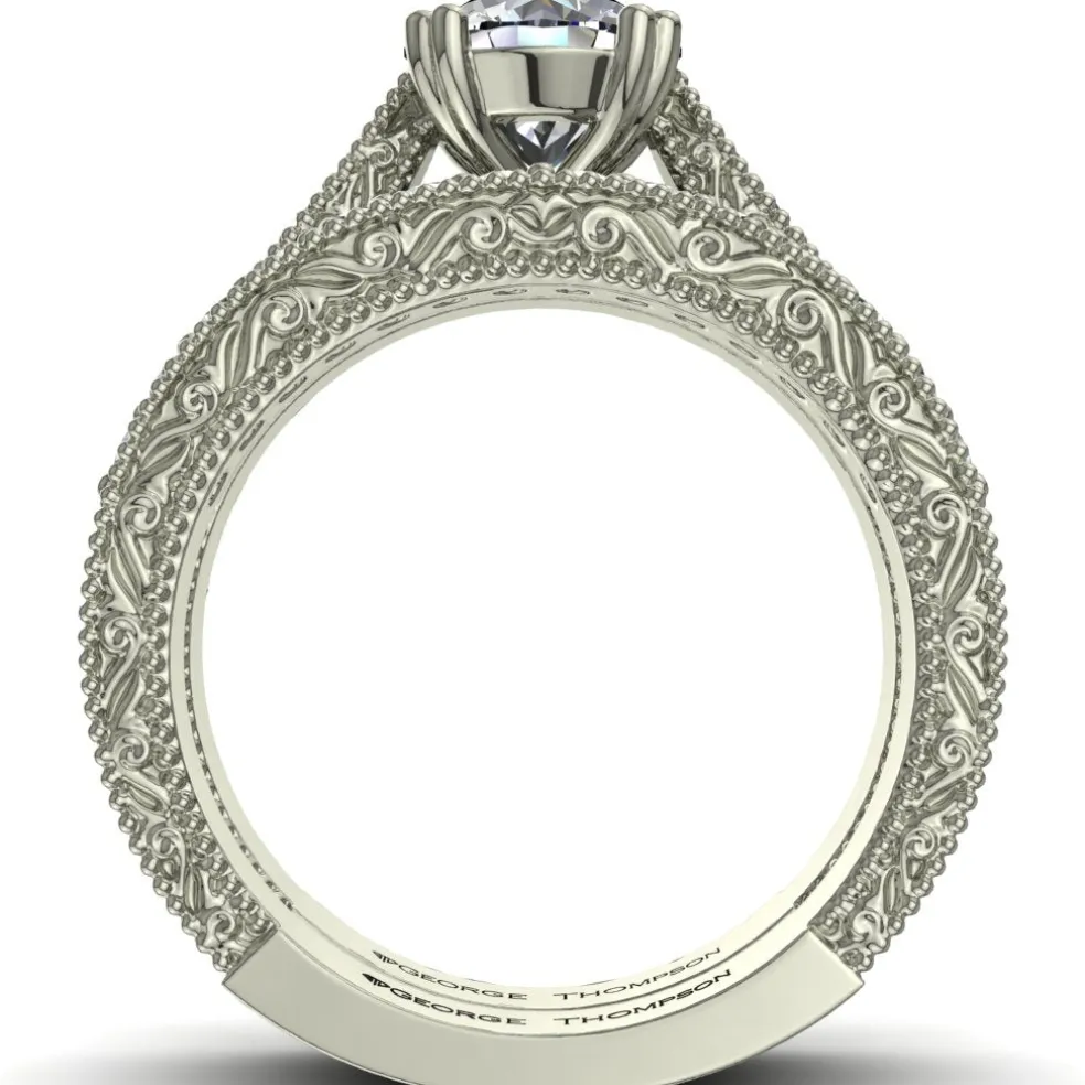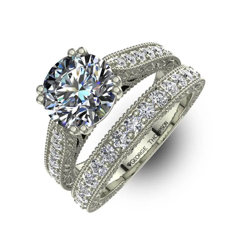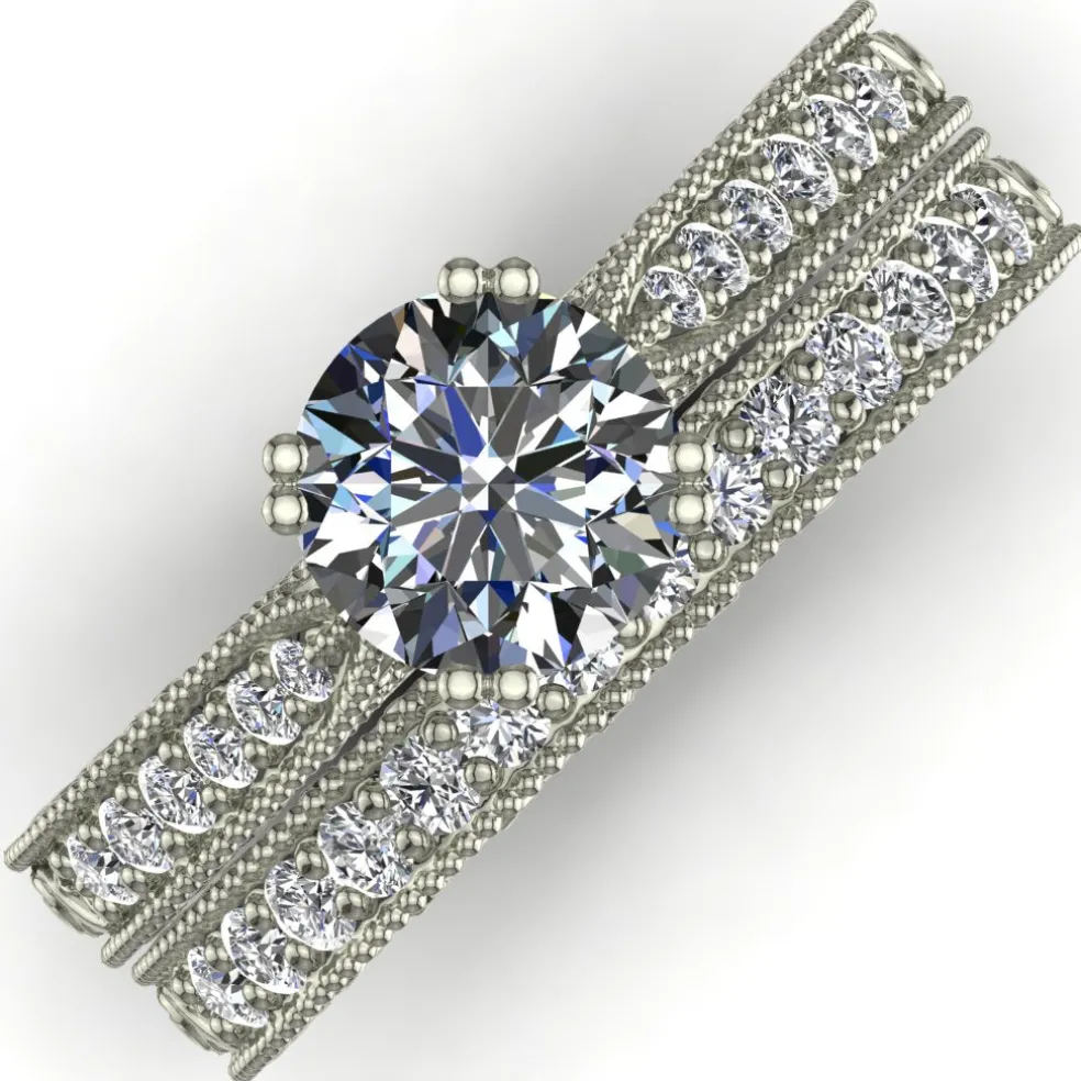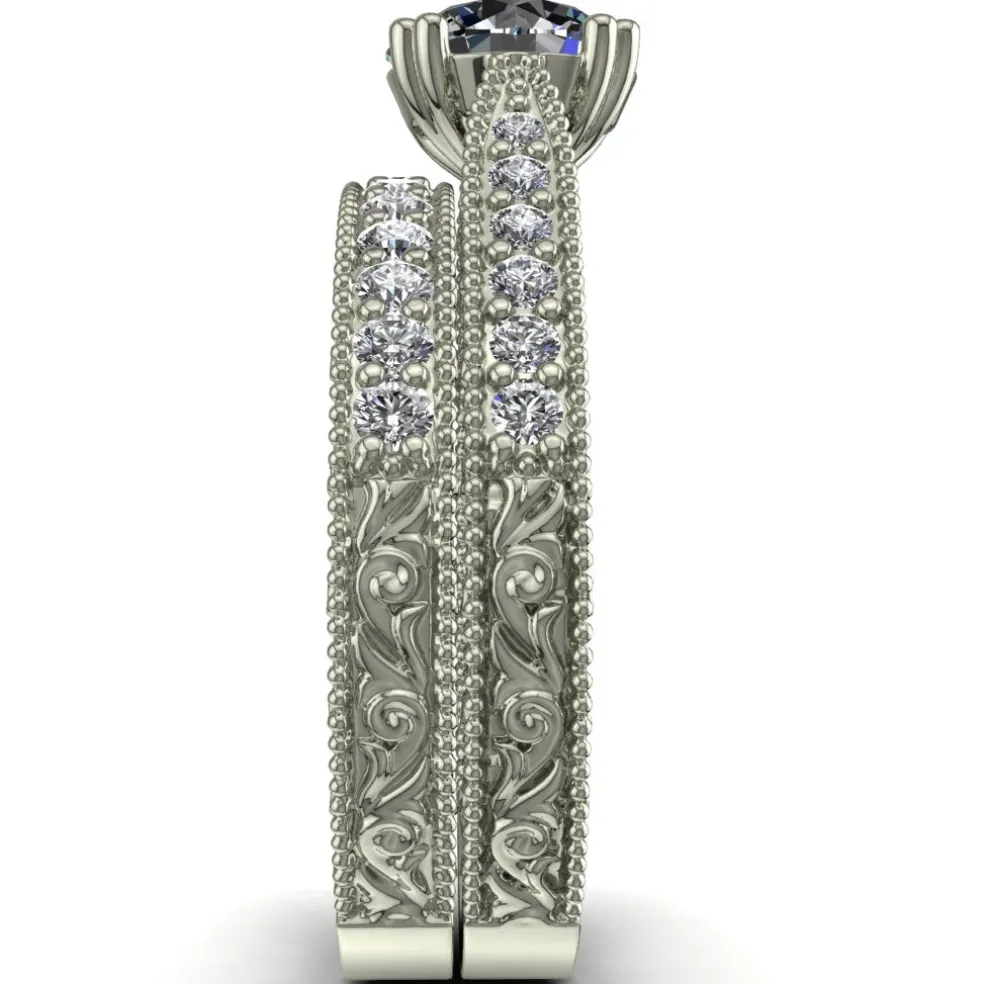 The Walida, a stunning work of art that’s sure to take your breath away! The centerpiece of this finely detailed ring is a magnificent 1.10 ct. round brilliant diamond, set in a lavish 14kt white gold band that weighs approximately 7.50 grams. The ring is also embellished with 28 round brilliant accent diamonds, with an approximate total weight of 0.35cts. The intricate design of the ring is a true testament to the skill and artistry of the jeweler, and the result is a wedding set with a total diamond weight of approximately 1.45cts.